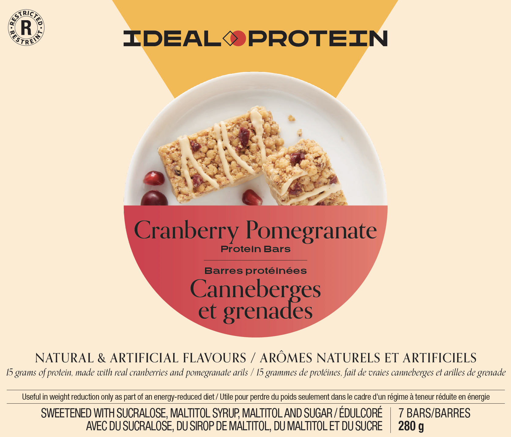 Mélange protéique (isolat de protéine de soja, concentré de protéine de lactosérum), Sirop de maltitol et maltitol, Sucre, Fructooligosaccharide, Huile végétale (huile de palmiste modifiée, huile de canola, huile de tournesol), Amidon de tapioca, Glycérine, Concentré de jus de pommes, Eau, Canneberges, Arômes naturels et artificiels, Poudre de concentré de jus de canneberge, Arilles de grenade, Monoglycérides, Bleuets, Acide citrique, Sel, Poudre de yogourt (lait écrémé, cultures bactériennes), Lécithine de soja, Sucralose (10 mg par barre (40 g)), Tocophérols.
