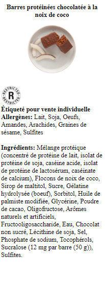 Mélange protéique (concentré de protéine de lait, isolat de protéine de soja, caséine acide, isolat de protéine de lactosérum, caséinate de calcium), Flocons de noix de coco, Sirop de maltitol, Sucre, Gélatine hydrolysée (bœuf), Sorbitol, Huile de palmiste modifiée, Glycérine, Poudre de cacao, Oligofructose, Arômes naturels et artificiels, Fructooligosaccharide, Eau, Chocolat non sucré, Lécithine de soja, Sel, Phosphate de sodium, Tocophérols, Sucralose (12 mg par barre (50 g)), Sulfites.