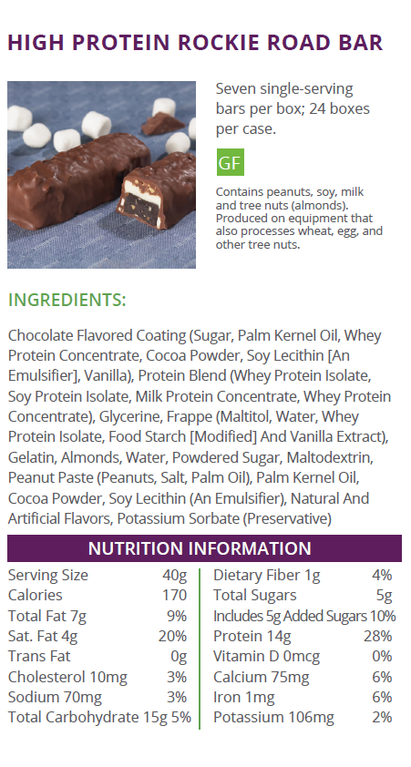 Enrobage aromatisé au chocolat (sucre, huile de palmiste, concentré de protéines de lactosérum, poudre de cacao, lécithine de soja [un émulsifiant], vanille), mélange de protéines (isolat de protéines de lactosérum, isolat de protéines de soja, concentré de protéines de lait, concentré de protéines de lactosérum), glycérine, frappé (maltitol, eau, isolat de protéines de lactosérum, amidon alimentaire [modifié] et extrait de vanille), gélatine, amandes, eau, sucre en poudre, maltodextrine, pâte d’arachide (arachides, sel, huile de palme), Huile de palmiste, poudre de cacao, lécithine de soja (émulsifiant), arômes naturels et artificiels, sorbate de potassium (conservateur).