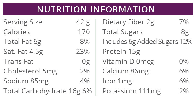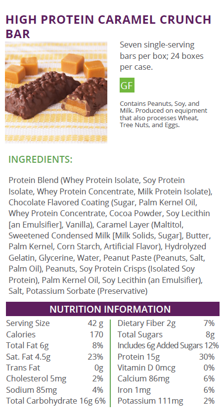 Mélange de protéines (isolat de protéines de lactosérum, isolat de protéines de soja, concentré de protéines de lactosérum, isolat de protéines de lait), enrobage aromatisé au chocolat (sucre, huile de palmiste, concentré de protéines de lactosérum, poudre de cacao, lécithine de soja [un émulsifiant], vanille), couche de caramel (maltitol, lait concentré sucré, [solides du lait, sucre], beurre, palmiste, amidon de maïs, arôme artificiel), gélatine hydrolysée, glycérine, eau, pâte d’arachide (arachides, sel, huile de palme), Cacahuètes, chips de protéines de soja (protéines de soja isolées), huile de palmiste, lécithine de soja (émulsifiant), sel, sorbate de potassium (conservateur).