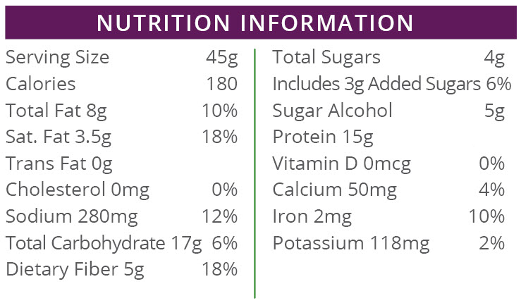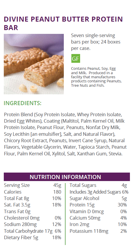INGRÉDIENTS: Mélange de protéines (isolat de protéines de soja, isolat de protéines de lactosérum, blancs d’œufs en poudre), enrobage (maltitol, huile de palmiste, isolat de protéines de lait, farine d’arachide, arachides, lait écrémé en poudre, lécithine de soja [émulsifiant], sel et arôme naturel), extrait de racine de chicorée, arachides, sirop de canne inverti, arômes naturels, glycérine végétale, eau, amidon de tapioca, farine d’arachide, huile de palmiste, xylitol, sel, gomme xanthane, Stévia.