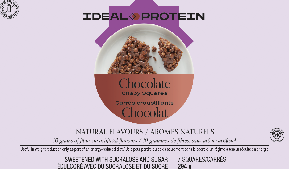 Isolat de protéine de soja, Oligofructose, Enrobage chocolaté (huile de palmiste modifiée, concentré de protéine de lait, maltitol, poudre de cacao, lécithine de soja, sucralose (4 mg par carré (42 g)), arômes naturels), Chocolat au lait (sucre, chocolat non sucré, poudre de lait entier, beurre de cacao, lécithine de soja, sel, extrait de vanille), Polydextrose (2,2 g par carré (42 g)), Dextrine de maïs, Glycérine, Huile de palme, Chocolat non sucré, Poudre de cacao, Isolat de protéine de lactosérum, Blancs d’oeufs (blancs d’œufs, levure, acide citrique), Agar-agar, Amidon de tapioca, Sel.