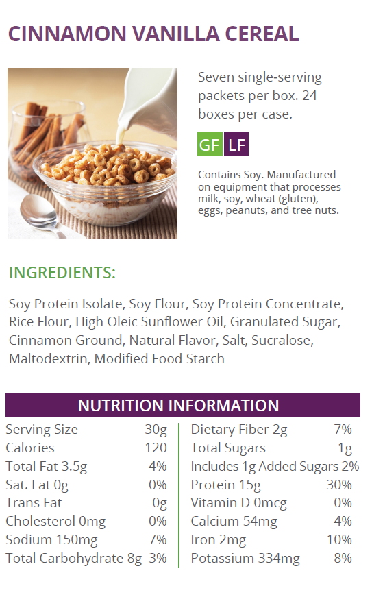 Isolat de protéines de soja, farine de soja, concentré de protéines de soja, farine de riz, huile de tournesol à haute teneur en acide oléique, sucre cristallisé, cannelle moulue, arôme naturel, sel, sucralose, maltodextrine, amidon alimentaire modifié.