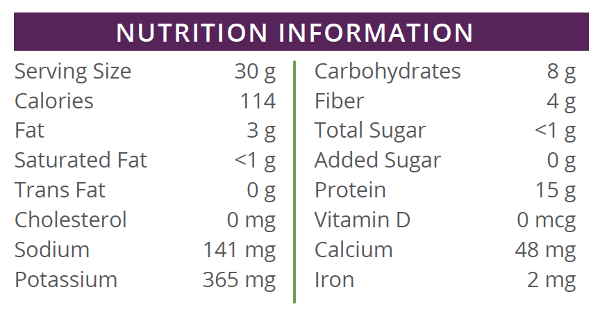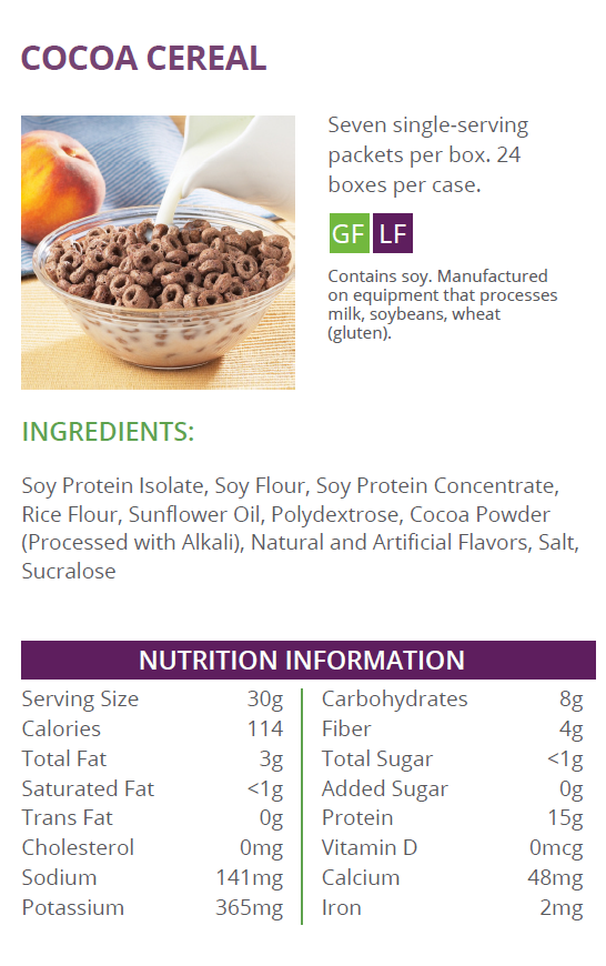 Isolat de protéine de soja, farine de soja, concentré de protéines de soja, farine de riz, huile de tournesol, polydextrose, poudre de cacao (traitée avec des alcalis), arômes naturels et artificiels, sel, sucralose.