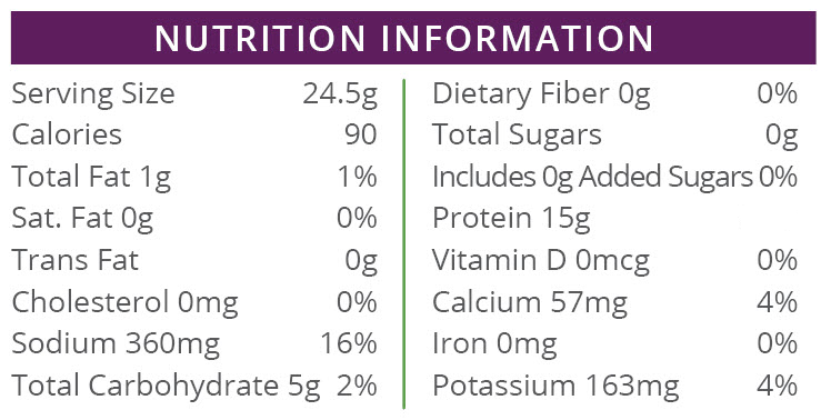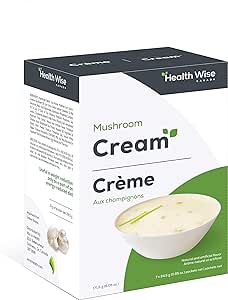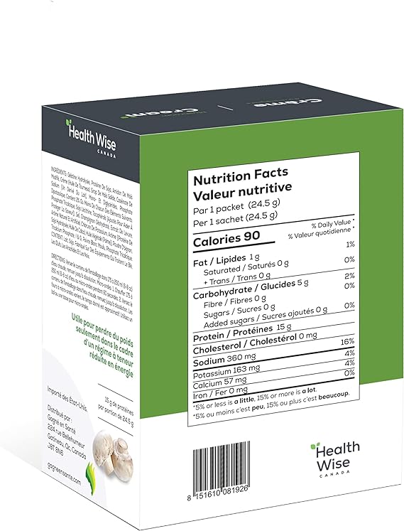 Gélatine hydrolysée, protéine de soja, amidon de maïs modifié, crème (huile de tournesol, extraits secs de sirop de maïs, caséinate de sodium [un dérivé du lait], mono- et diglycérides, phosphate dipotassique, contient 2 % ou moins de chacun des éléments suivants : phosphate tricalcique, soja lécithine, tocophérols [ajoutés pour aider à protéger la saveur]), sel, champignon déshydraté, extrait de levure, arôme naturel et artificiel, chlorure de potassium, arôme [(protéine de soja hydrolysée, huile de colza), huile végétale (palme)], poudre d’oignon, tricalcium Phosphate, I&G, poivre blanc moulu, phosphate tricalcique.