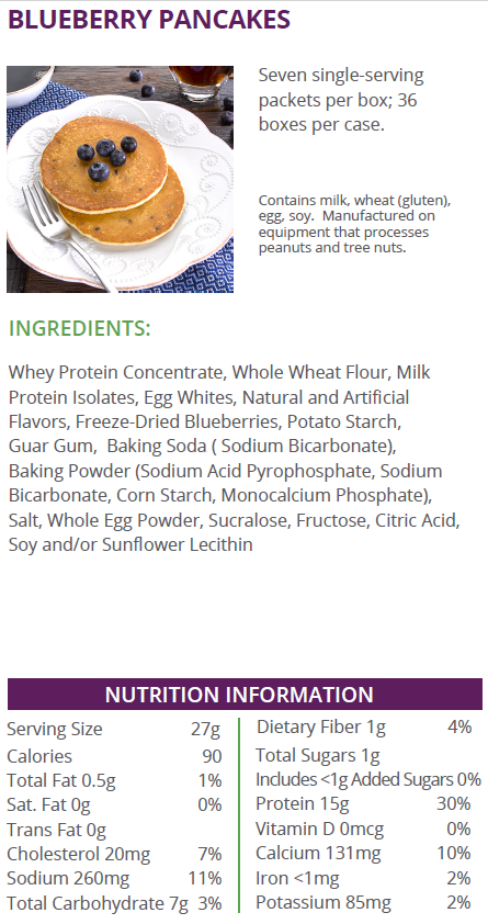 Concentré de protéines de lactosérum, farine de blé entier, isolats de protéines de lait, blancs d’œufs, arômes naturels et artificiels, bleuets lyophilisés, fécule de pomme de terre, gomme de guar, bicarbonate de soude (bicarbonate de sodium), poudre à pâte (pyrophosphate acide de sodium, bicarbonate de sodium, amidon de maïs, phosphate monocalcique), sel, œuf entier en poudre, sucralose, fructose, acide citrique, lécithine de soja et/ou de tournesol