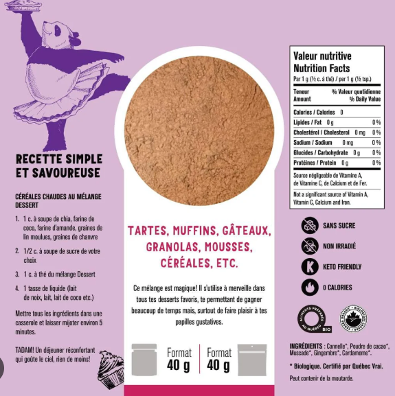 apotes sur les assaisonnements et épices Les Savoureux si bien que tu les manges presque à la cuillère? Pas de problème… Ici on t’offre une alternative économique pour te procurer en VRAC une grosse batch (125g) de notre savoureux mélange d’épices à Dessert dans un sac en papier écologique qui te servira à remplir ton pot original Les Savoureux.