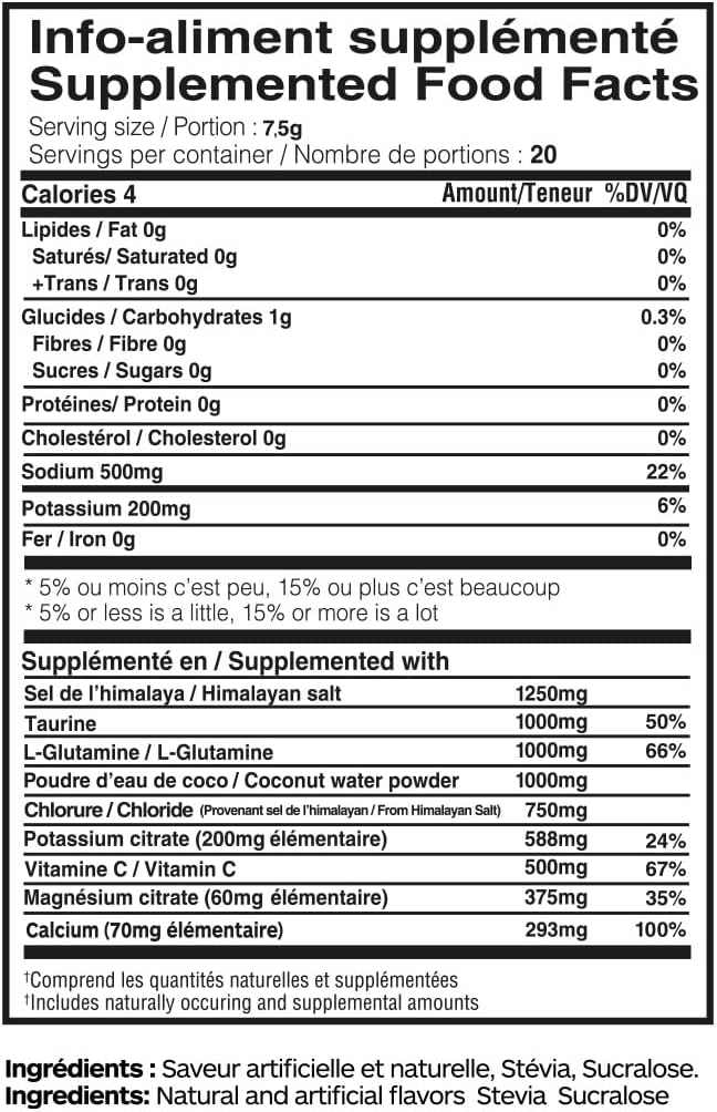 • Réhydratation efficace : Chaque portion fournit 500 mg de sodium et 200 mg de potassium, essentiels pour maintenir l’équilibre hydrique et prévenir la déshydratation.