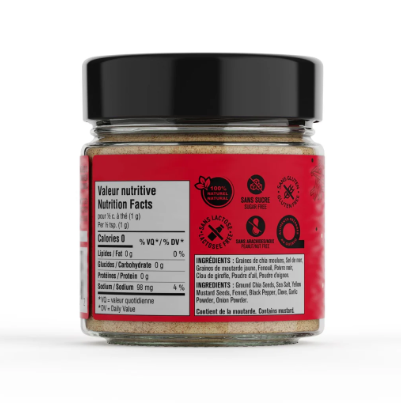 Graines de chia moulues, sel de mer, moutarde en poudre, fenouil, poivre noir, clou de girofle, poudre d’ail, oignon en poudre.