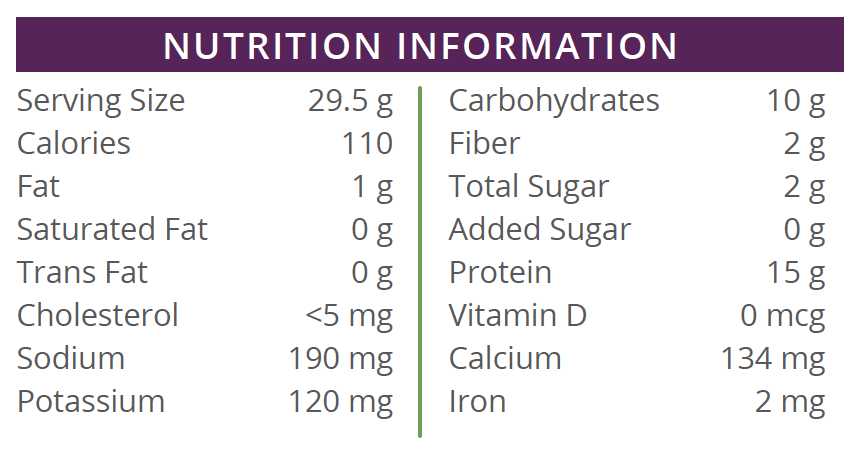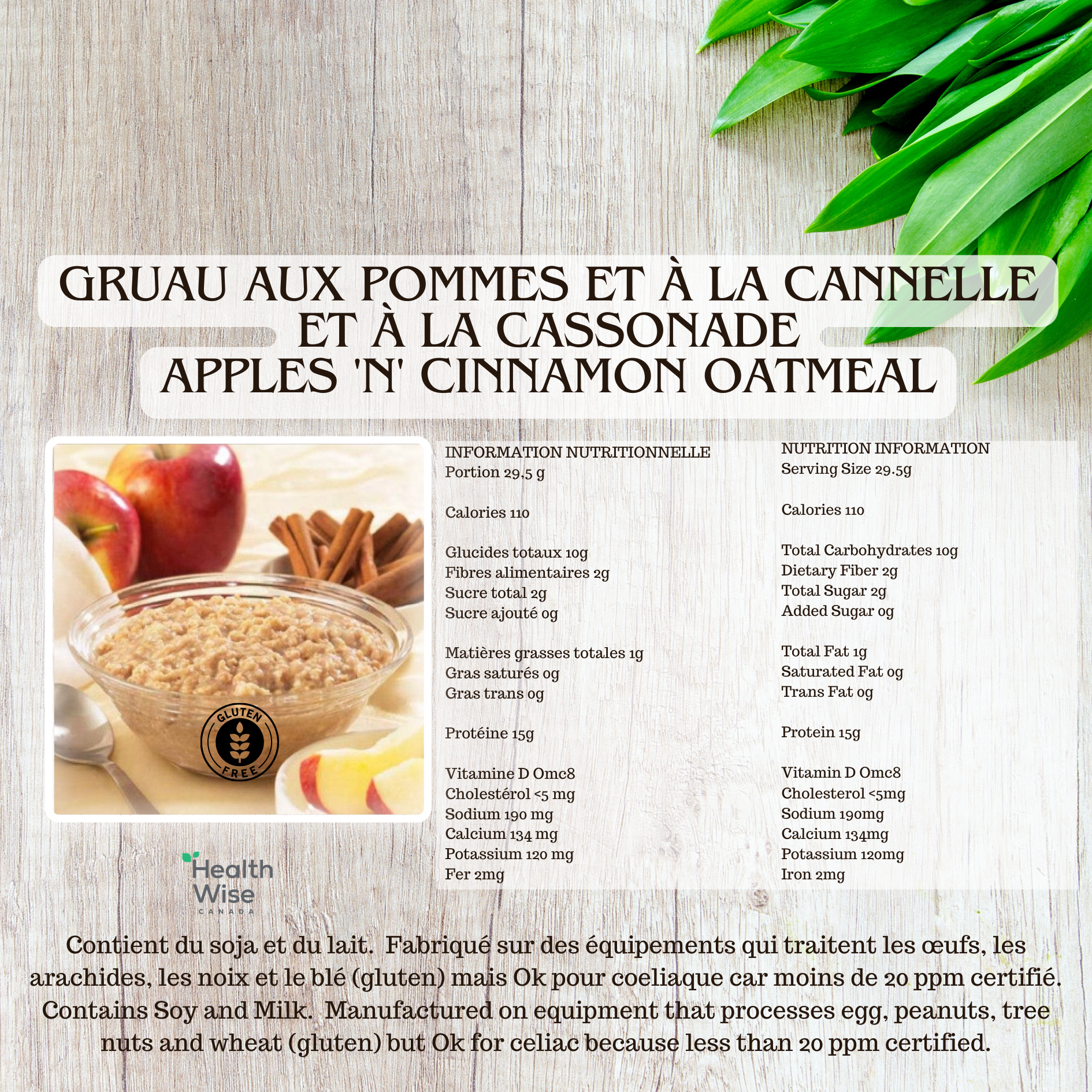 Avoine instantanée, protéine de soja, isolat de protéines de lait, pommes séchées en dés, arôme de pomme cuite au four, cannelle moulue, poudre de xanthane, bicarbonate de sodium, sel, acide citrique, sucrlalose.