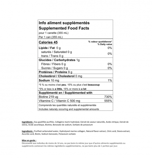 Mise en garde : Déconseillé aux individus de moins de 14 ans, ne pas boire le même jour que d’autres aliments supplémentés ou suppléments contenant les mêmes ingrédients supplémentaires. Ne pas boire plus de 1 canette par jour.