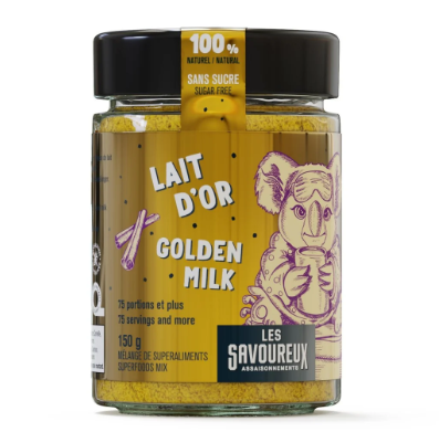 Certain appel ce mélange LATTÉ AU CURCUMA du fait qu’il peut être incorporé dans votre lait préféré, chaud et froid dans de la glace et dans de l’eau. Le poivre noir augmente de façon exponentielle l’absorption du curcuma. Le mélange LAIT D’OR Les Savoureux est rempli de nutriments.