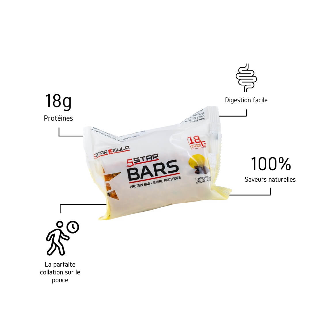 Les barres 5STAR sont un snack protéiné composé d’ingrédients 100% naturels. Que vous souhaitiez manger « sur le pouce » avant ou après une séance d’activité physique, les BARRES 5STAR sont tout simplement un délice en bouche et constituent une excellente collation qui vous apporte 18 g de protéines.