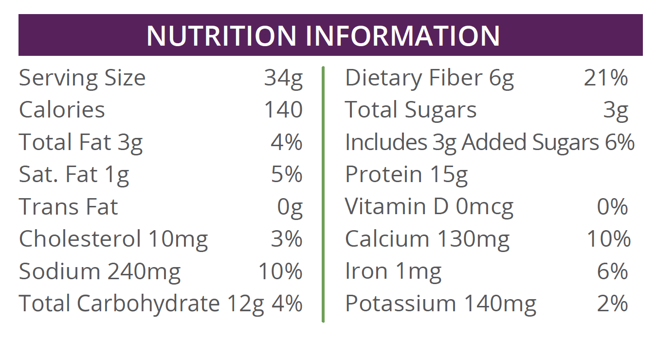 Isolat de protéines de soja, flocons de pommes de terre, fécule de pomme de terre, farine de soja, carbonate de calcium, concentré de protéines de lactosérum, inuline, isolat de protéines de lait, arômes naturels, pépites de chocolat à la vanille, farine de riz, poudre de cacao (traitée avec de l’alcali), huile de tournesol, blancs d’œufs en poudre, bicarbonate de sodium, sel, gomme xanthane, sucralose et lécithine de soja.
