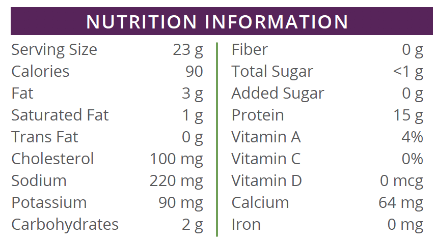 Concentré de protéines de lactosérum, œufs, blancs d’œufs, protéines végétales texturées (farine de soja, colorant caramel et FD&C Red #3), arômes naturels, sel, extrait de levure. Contient moins de 2% des éléments suivants : Huile de soja, Colorant bêta-carotène (maltodextrine, gomme d’acacia, saccharose, huile végétale, ascorbate de sodium, bêta-carotène USP, di-alpha-tocophérol, dioxyde de silicium [antiagglomérant]), Poudre de tomate, Poudre d’oignon, Poudre d’ail, Épices, Huile de tournesol (agent anti-poussière), Lécithine de soja.