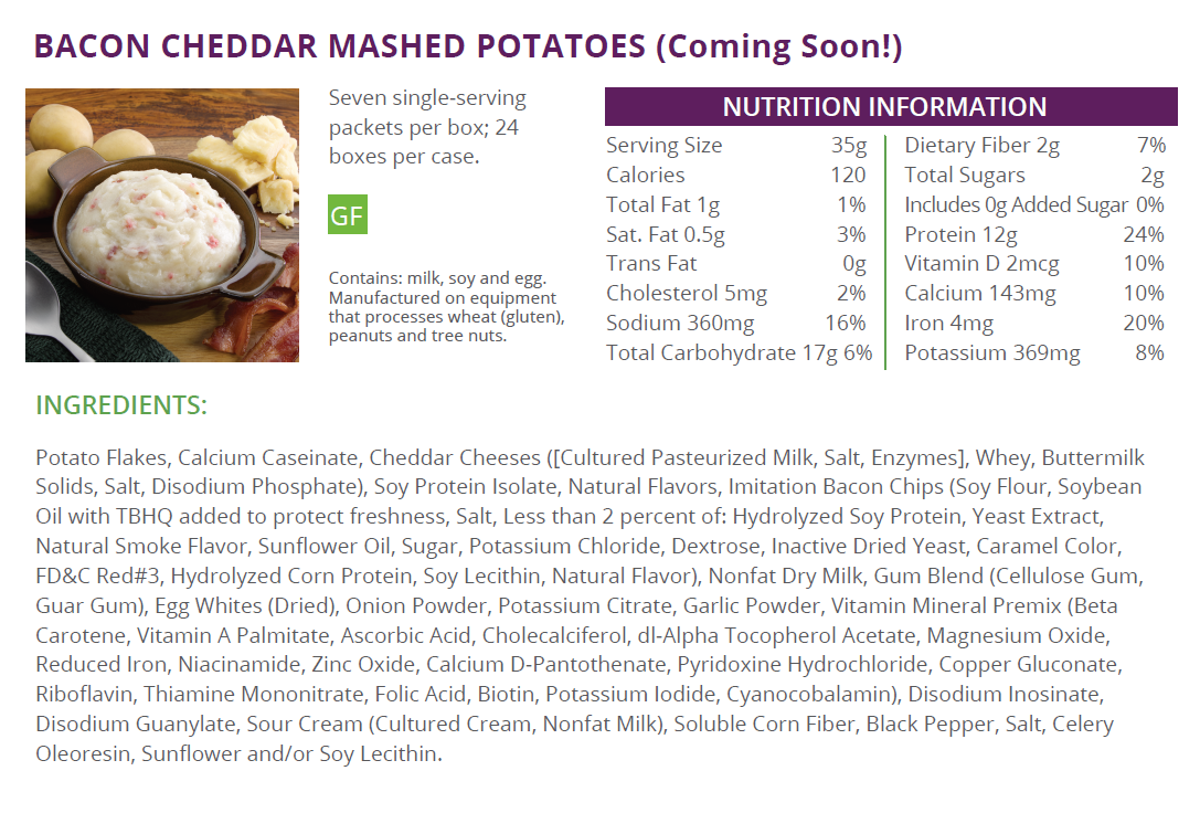 Flocons de pommes de terre, caséinate de calcium, fromages cheddar ([lait pasteurisé de culture, sel, enzymes], lactosérum, solides de babeurre, sel, phosphate disodique), isolat de protéines de soja, arômes naturels, croustilles d’imitation de bacon (farine de soja, huile de soja avec TBHQ ajouté pour protéger la fraîcheur, sel, moins de 2 % de : protéines de soja hydrolysées, extrait de levure, arôme naturel de fumée, huile de tournesol, sucre, chlorure de potassium, dextrose, levure séchée inactive, Colorant caramel, FD&C Red#3, Protéine de maïs hydrolysée, Lécithine de soja, Arôme naturel), Lait écrémé en poudre, Mélange de gomme (gomme de cellulose, Gomme de guar), Blancs d’œufs (séchés), Poudre d’oignon, Citrate de potassium, Poudre d’ail, Prémélange de vitamines minérales (bêta-carotène, palmitate de vitamine A, acide ascorbique, cholécalciférol, acétate de dl-alpha-tocophérol, oxyde de magnésium, fer réduit, niacinamide, oxyde de zinc, D-pantothénate de calcium, chlorhydrate de pyridoxine, Gluconate de cuivre, riboflavine, mononitrate de thiamine, acide folique, biotine, iodure de potassium, cyanocobalamine), inosinate disodique, guanylate disodique, crème sure (crème de culture, lait écrémé), fibre de racine de chicorée, poivre noir, sel, oléorésine de céleri, lécithine de tournesol et/ou de soja.