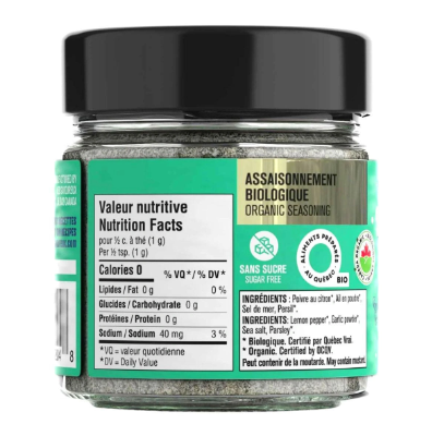INGRÉDIENTS: Poivre au citron (zeste de citron, poivre, épices, acide citrique), ail en poudre, sel de mer, persil. Peut contenir de la moutarde. Ingrédients 100% naturels.