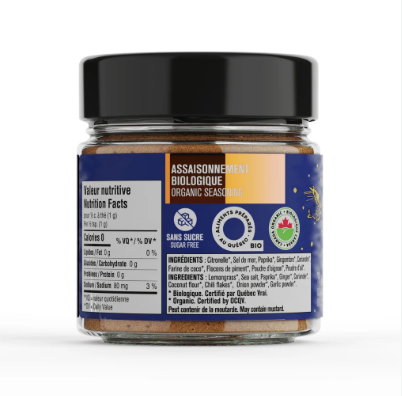 Ingrédients: Citronnelle, Sel de mer, Paprika, Gingembre, Coriandre, Farine de coco, Flocons de piments, Poudre d’oignon et Poudre d’ail.
