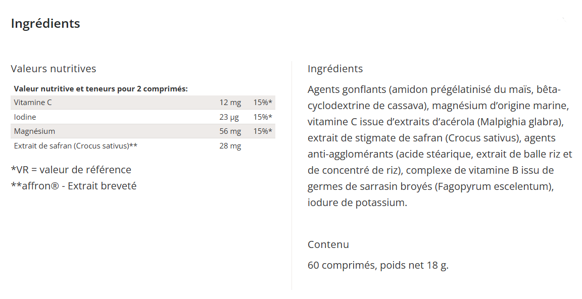 Viva+ est une combinaison d’affron®, un extrait standardisé et breveté de stigmates de safran purs et de haute qualité (Crocus sativus L) d’Espagne, d’un complexe de vitamines B issu du sarrasin, de magnésium provenant de l’eau de mer, d’iode et de vitamine C issue de l’acérola.